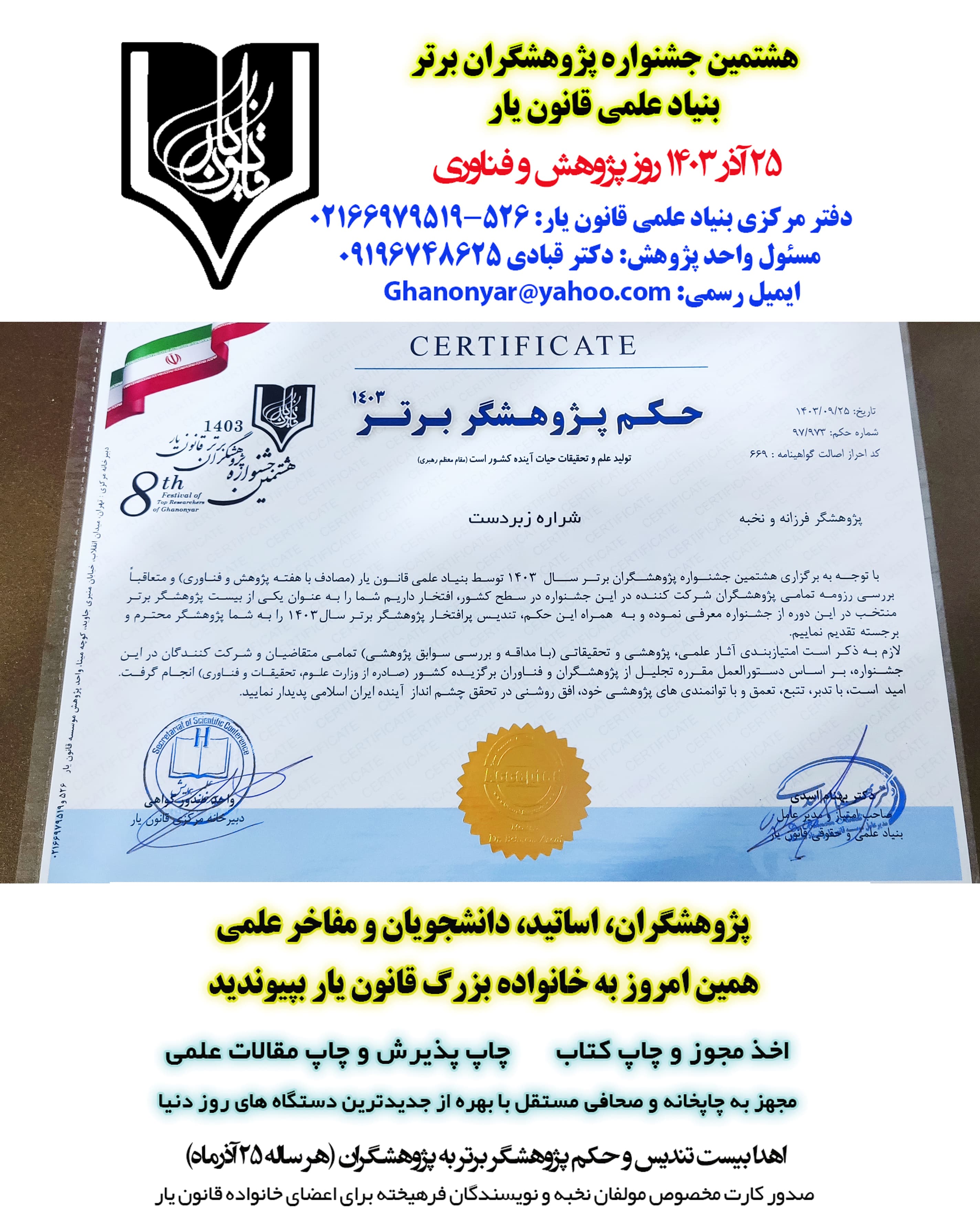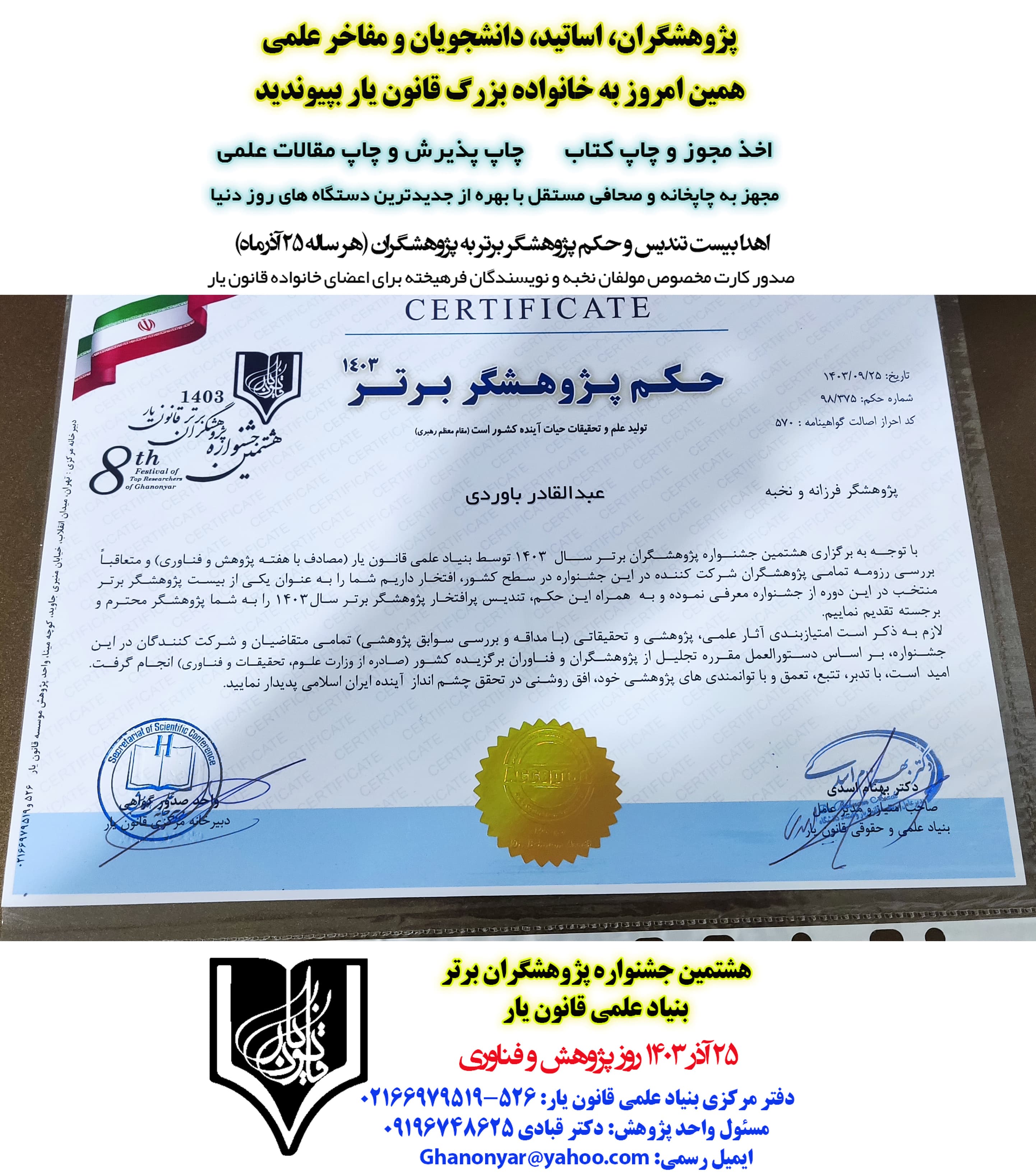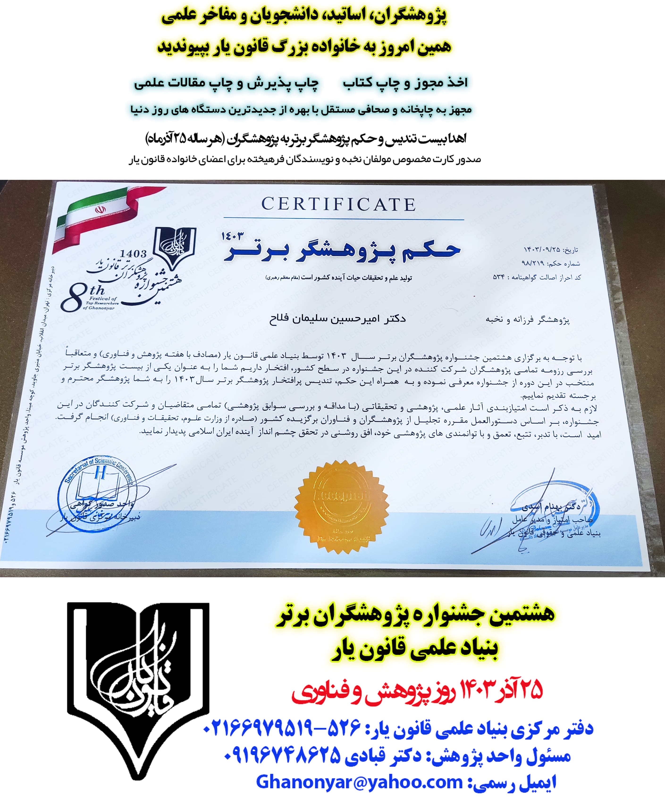 حکم و گواهی انتخاب پژوهشگران برتر سال 1403 قانون یار