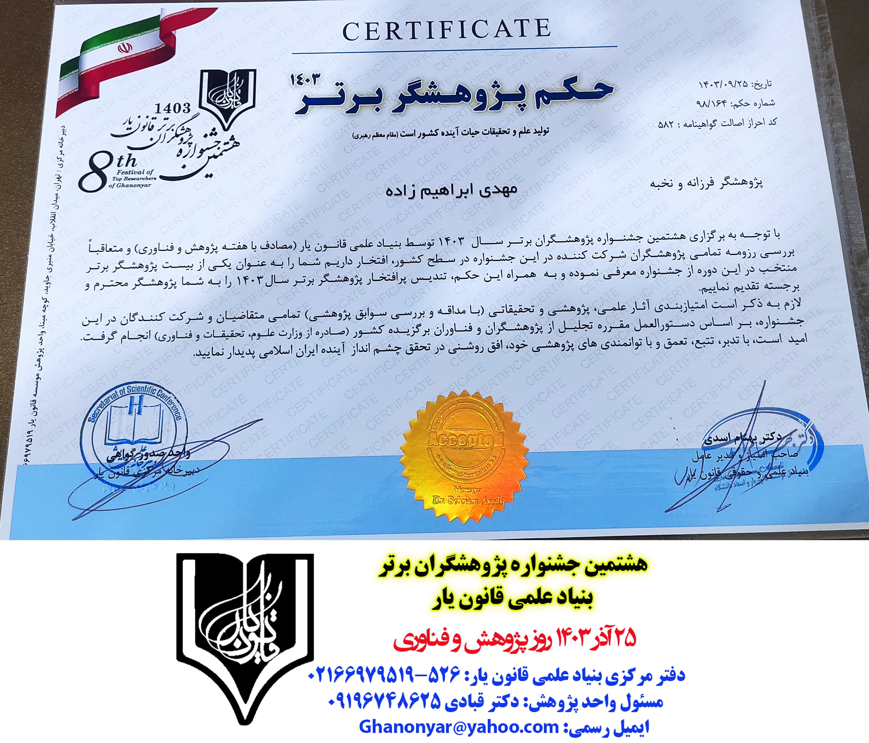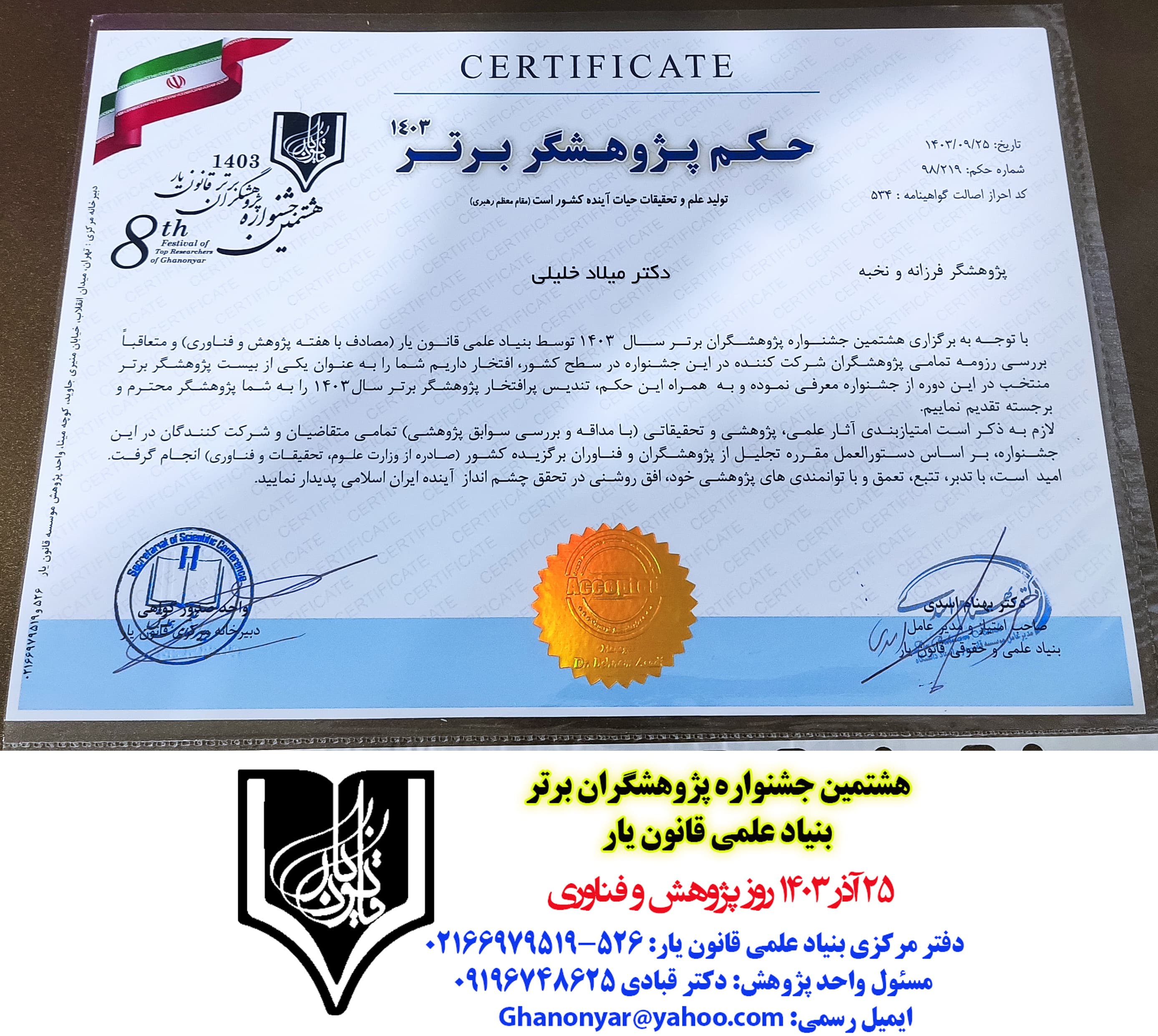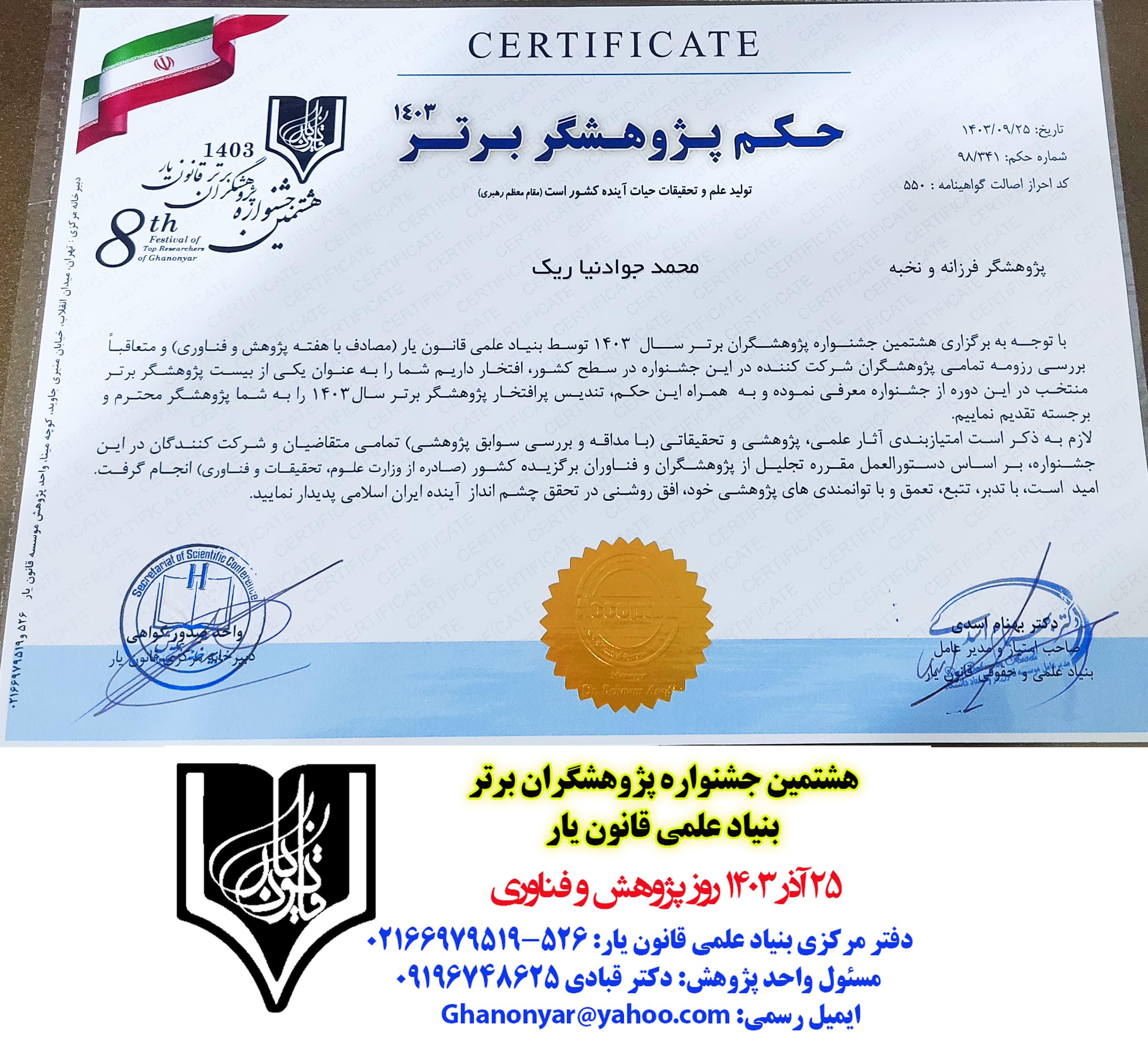 حکم و گواهی انتخاب پژوهشگران برتر سال 1403 قانون یار